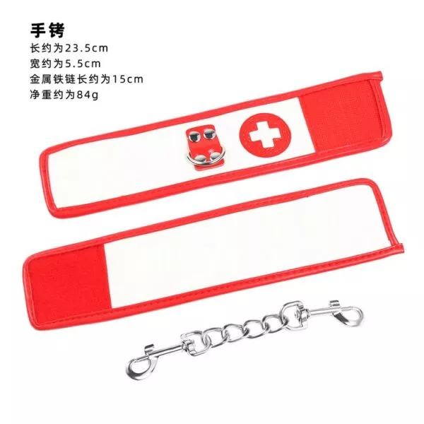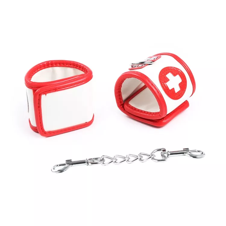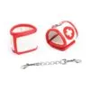 סט אזיקי ידיים לבן עם גימורים אדומים והדפס של פלוס, הסמל המוכר של חיל הרפואה. האזיקים מאופיינים באבזמי מתכת וטבעת D.