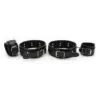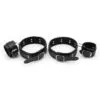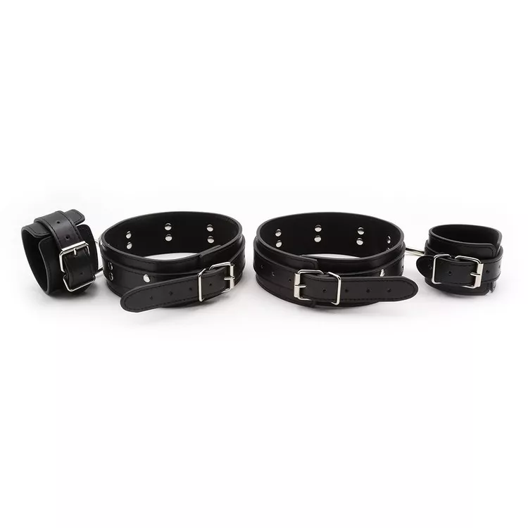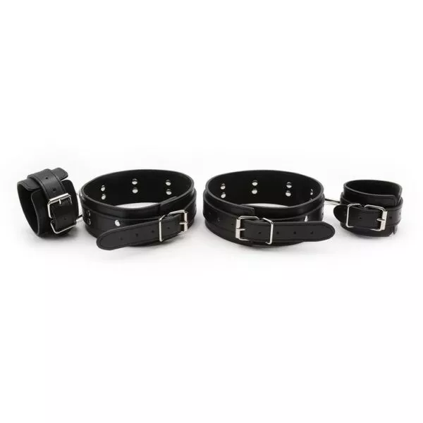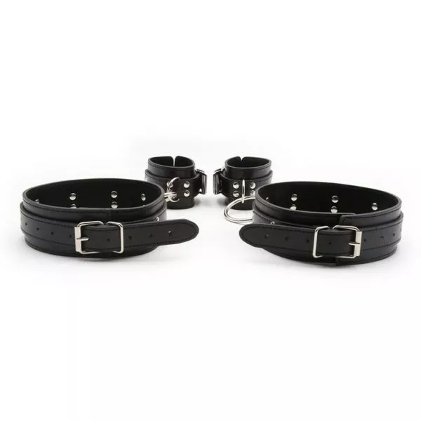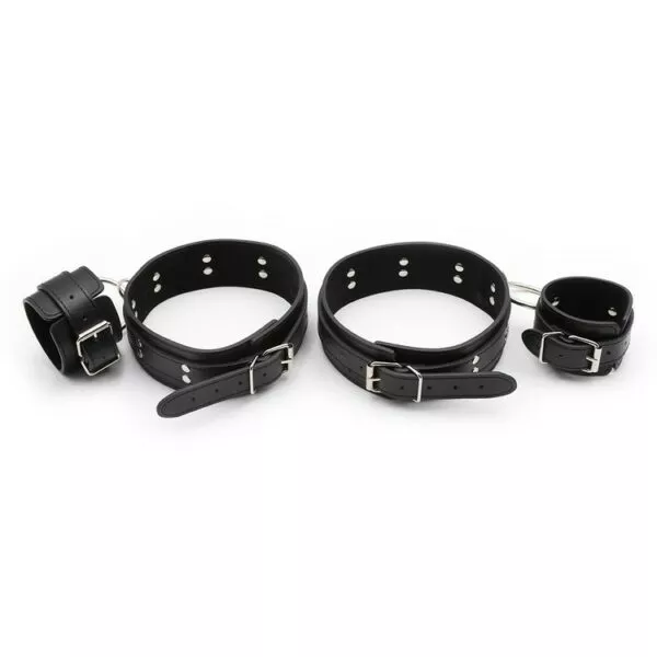 ערכת אזיקי ידיים וירכיים בצבע שחור, משולבים באבזמי מתכת. מהווים מתנה אידיאלית ליום הולדת, ליום האהבה, או לערב שובב ומפתיע של גירוי חושני. האזיקים, אלגנטיים במיוחד, נסגרים באמצעות אבזם מתכת. כל אחד מהאזיקים מכיל טבעת D המחברת אותם באמצעות טבעת עגולה לצמד אזיקי ירכיים תואמים, הם גם נסגרים באבזמי מתכת. הערכה מגבילה את המשתמש בה ומונעת הזזת הידיים וחיבורם לצידי הגוף. מידות אזיקי הידיים: 20 ס"מ/5 ס"מ, טווח היקף כל אזיק: 20-27.50 ס"מ. מידות אזיקי הירכיים: 47.5 ס"מ/5 ס"מ, טווח היקף הקולר: 37-55 ס"מ.