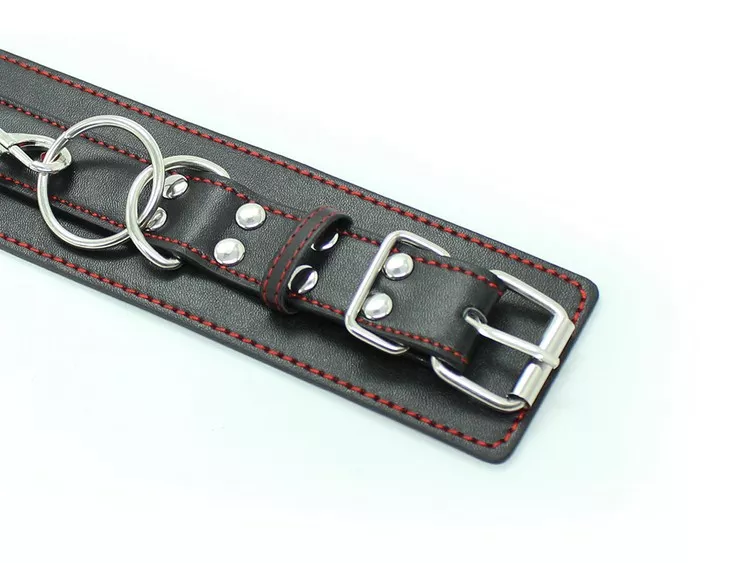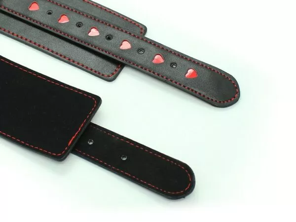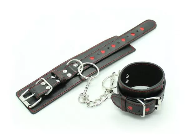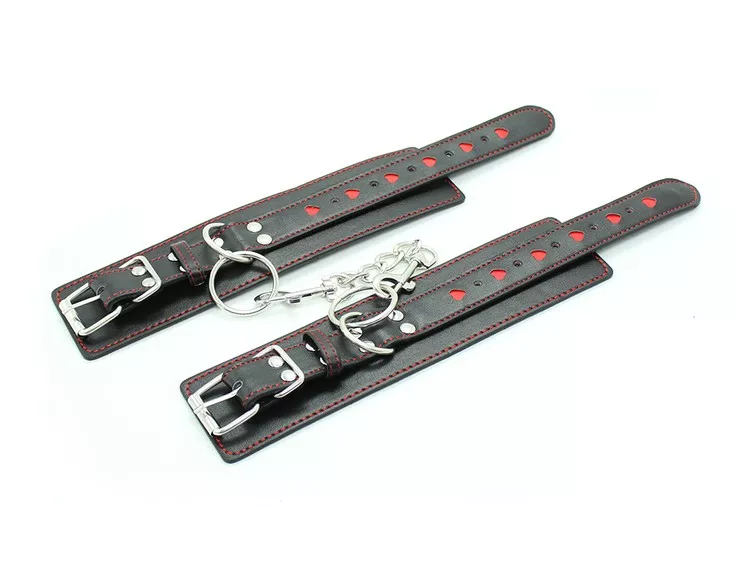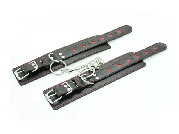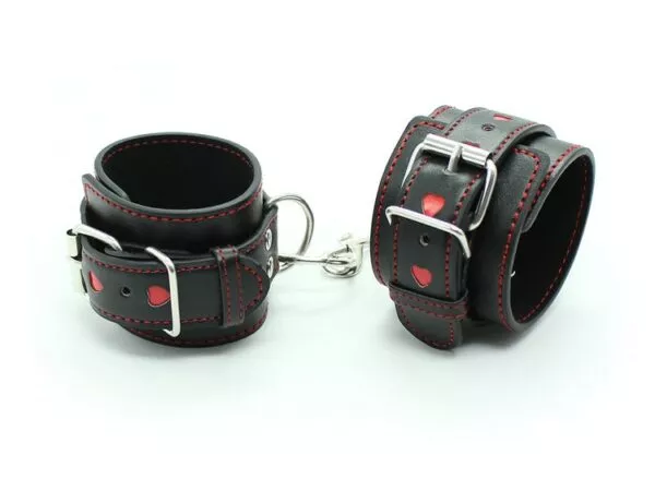 אזיקי רגליים דמויי עור בצבע שחור עם תפר אדום ולבבות רקועים. הם בחירה מעולה לזוגות המעוניינים באלמנט של רומנטיקה ואלגנטיות במשחקים האינטימיים שלהם.