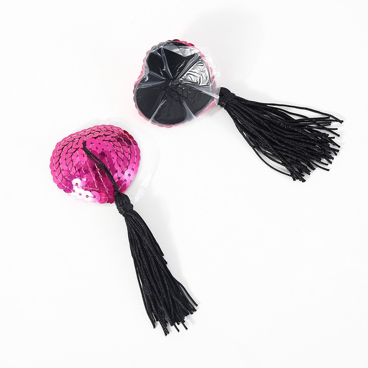 הכניסו ניצוץ של פיתוי ושובבות לחדר השינה עם כיסוי פטמות בצורת לב, המעוטר בפייטים ורודים זוהרים ופרנזים שמתנדנדים עם כל תנועה.